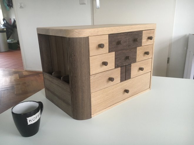 Voor een klant ontwierp en bouwde ik een ladekastje geïnspireerd op de Amsterdamse school. Het kastje is uitgevoerd in licht eiken en wengé.
